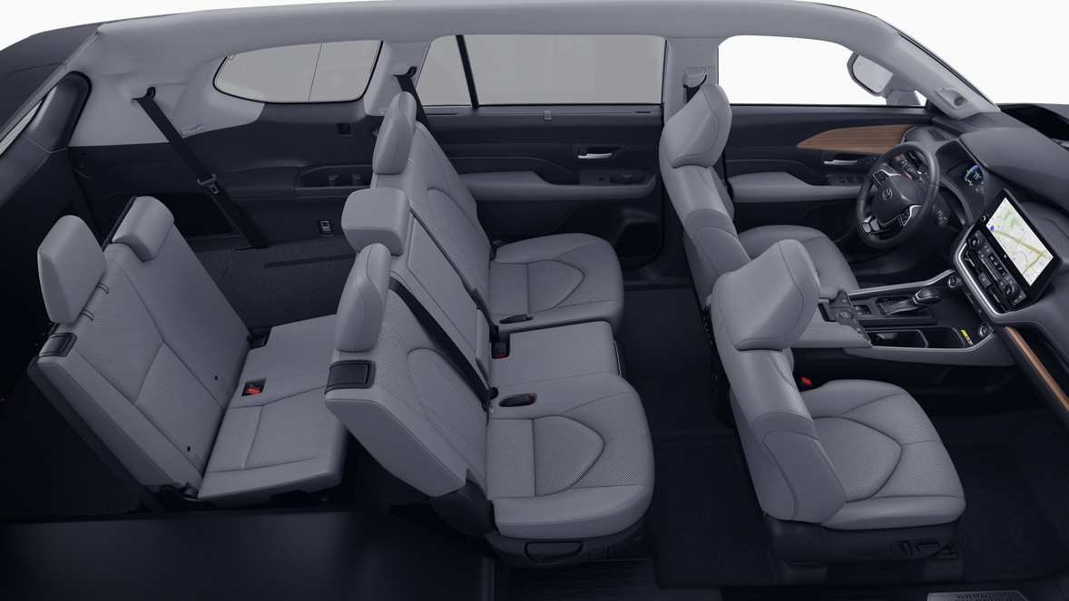 • 7-passenger seating with second-row fold-down captain's chairs and fold-down inboard armrests, adjustable headrests and two cup holders mounted on the floor; and 60/40 split, fold-down third-row seats with sliding headrests and recline function