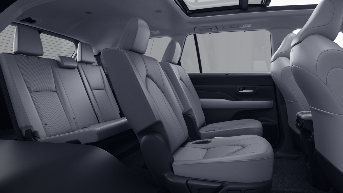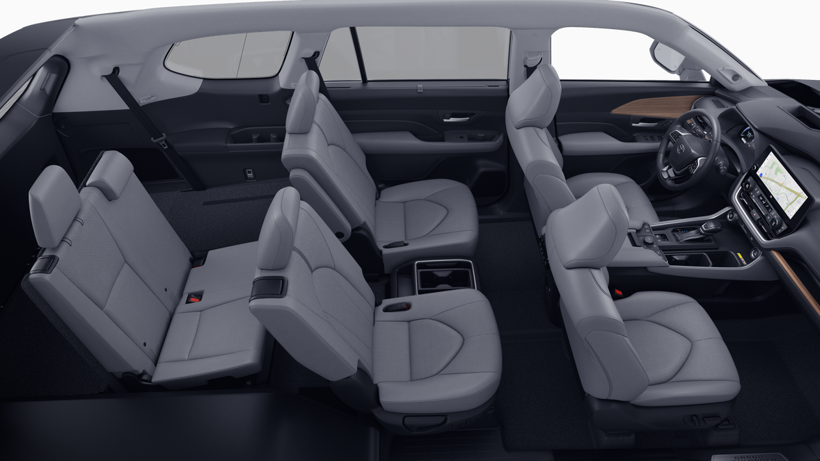 • 7-passenger seating with second-row fold-down captain's chairs and fold-down inboard armrests, adjustable headrests and two cup holders mounted on the floor; and 60/40 split, fold-down third-row seats with sliding headrests and recline function