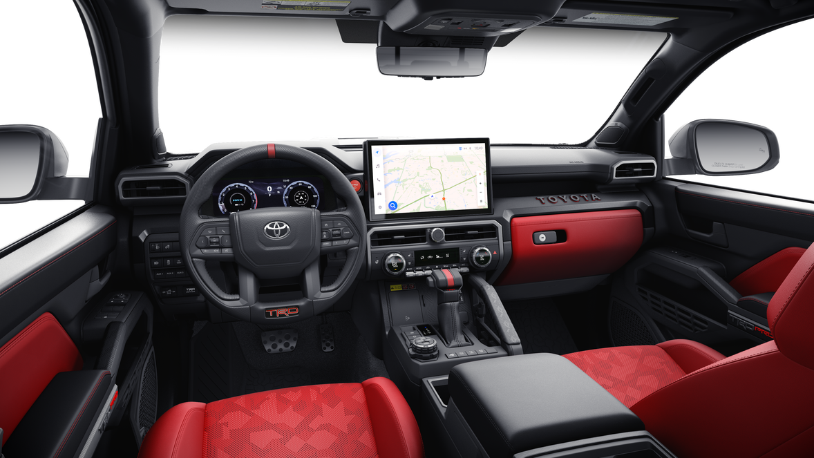 • TRD Pro leather-trimmed manual tilt/telescopic steering wheel with TRD badge, red center stripe, and phone, audio, display/infotainment, and Driver Assist controls