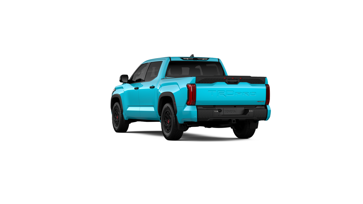 • "TRD PRO" hood badge; black door handles; black window molding and mirror caps; black technical-camo-grained tailgate spoiler and overfenders with marker lights
