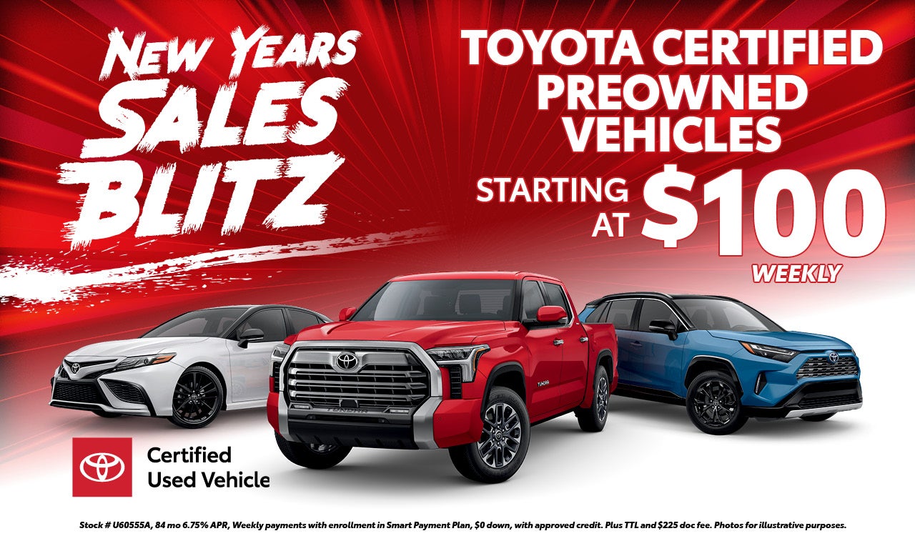 Toyota Certified Used Vehicles starting at $99.99 payments! Stock # U60555A, 84 mo 6.75% APR, Weekly payments with enrollment in Smart Payment Plan, $0 down, with approved credit. Plus TTL and $225 doc fee. Photos for illustrative purposes.