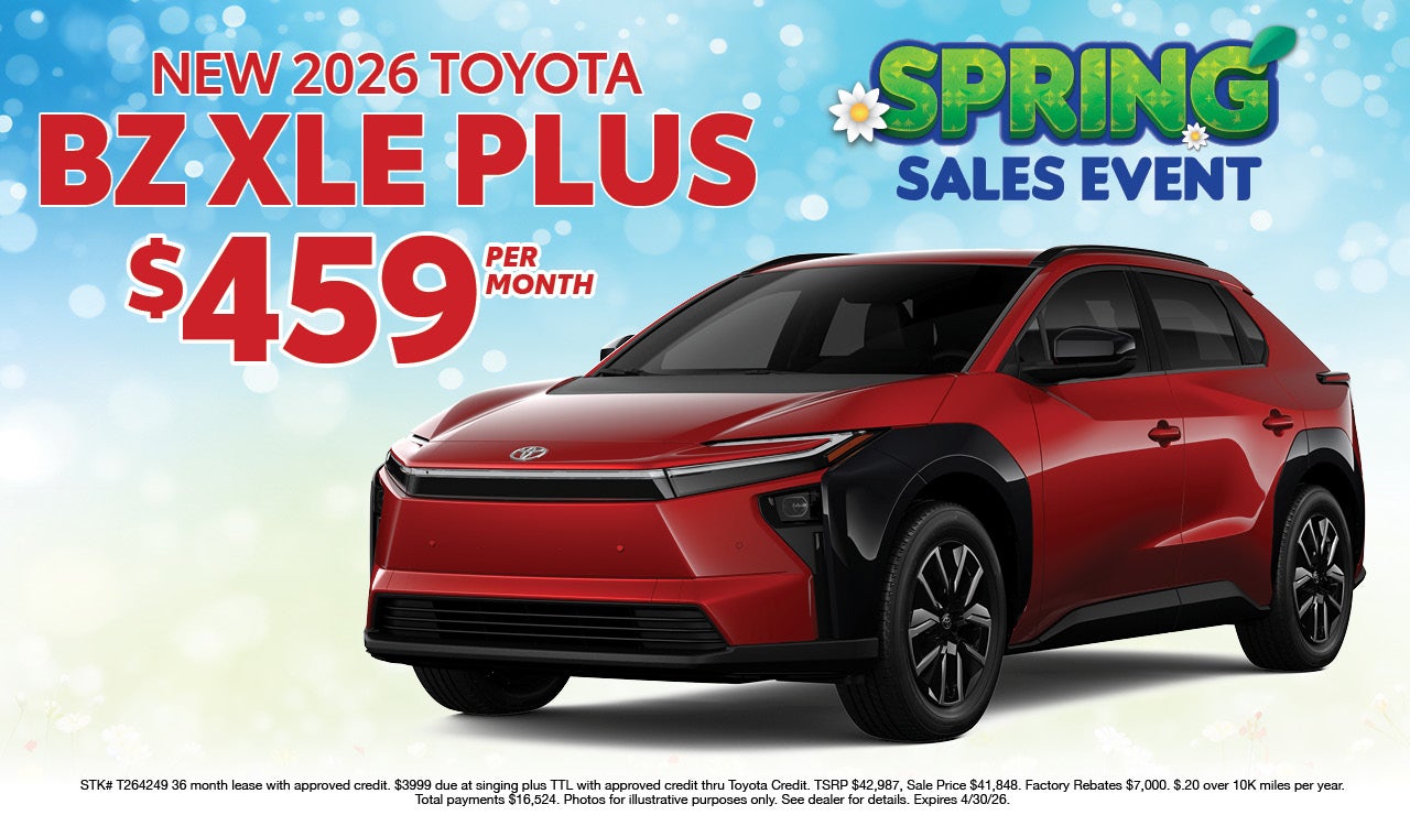 New 2026 BZ XLE PLUS $459 per month STK# T264249 36 month lease with approved credit. $3999 due at singing plus TTL with approved credit thru Toyota Credit. MSRP $42,987, Sale Price $41,848. Factory Rebates $7,000. $.20 over 10K miles per year. Total payments $16,524. Photos for illustrative purposes only. See dealer for details. Expires 4/30/26.