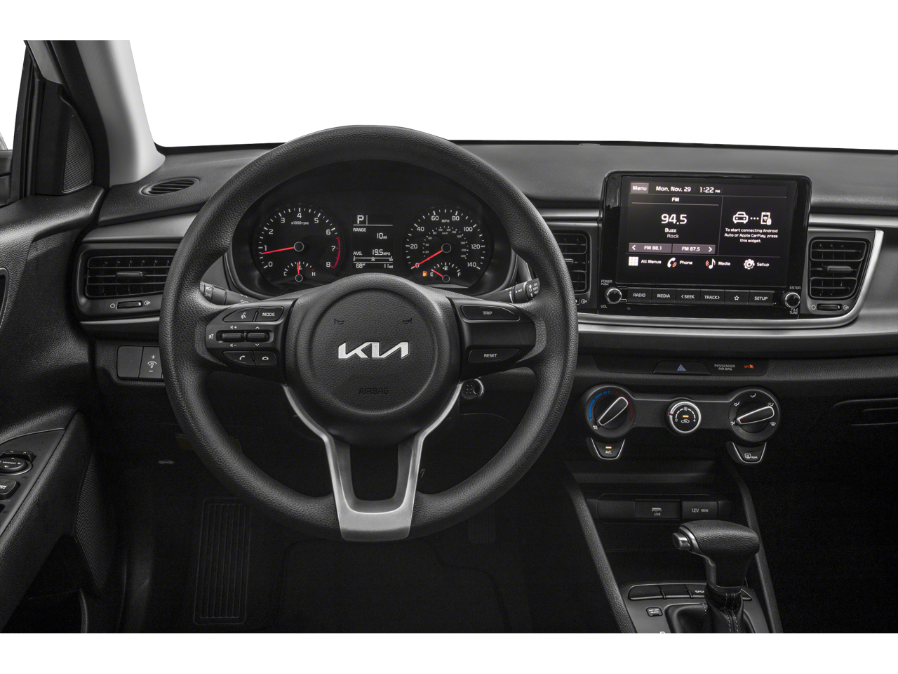 6 Speakers, ABS brakes, Air Conditioning, AM/FM radio, Brake assist, Bumpers: body-color, Carpet Floor Mats, Driver door bin, Driver vanity mirror, Dual front impact airbags, Dual front side impact airbags, Electronic Stability Control, Front anti-roll bar, Front Bucket Seats, Front reading lights, Front wheel independent suspension, Fully automatic headlights, Heated door mirrors, Illuminated entry, Low tire pressure warning, Occupant sensing airbag, Outside temperature display, Overhead airbag, Overhead console, Panic alarm, Passenger door bin, Passenger vanity mirror, Power door mirrors, Power steering, Power windows, Radio: AM/FM/MP3 Audio System, Rear window defroster, Speed-sensing steering, Steering wheel mounted audio controls, Tachometer, Tilt steering wheel, Traction control, Trip computer, Variably intermittent wipers, Wheels: 15" x 5.5J Steel w/Full Covers, Woven & Tricot Cloth Seat Trim.